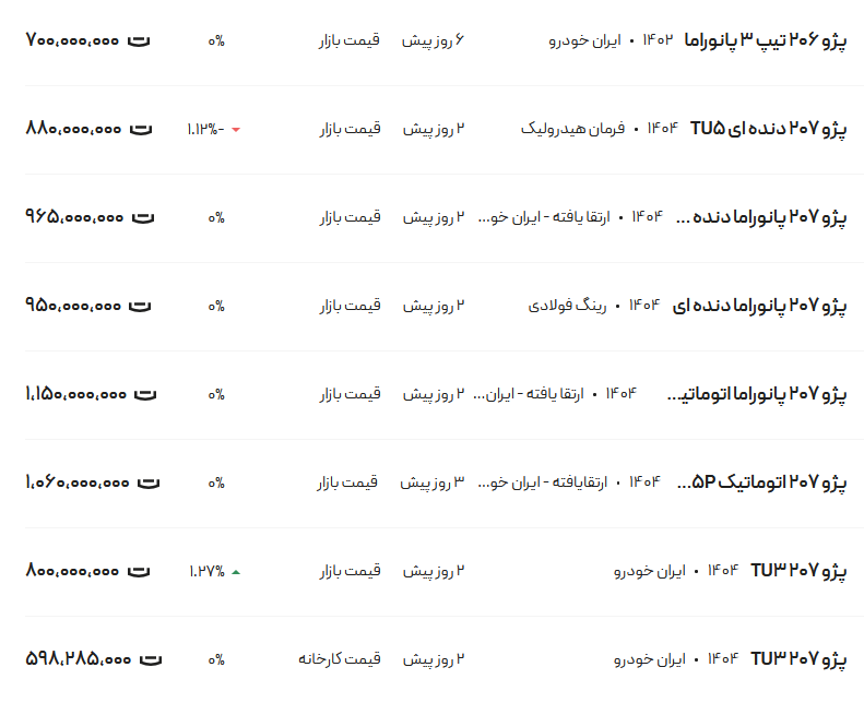 سرویس اقتصاد «انتخاب»: قیمت پژو ۲۰۶ و ۲۰۷، امروز ۲۳ فروردین ۱۴۰۴ در مدلهای مختلف شامل «تیپ ۵- تیپ ۲- SD-TU ۵ P-دندهای» اعلام شد.