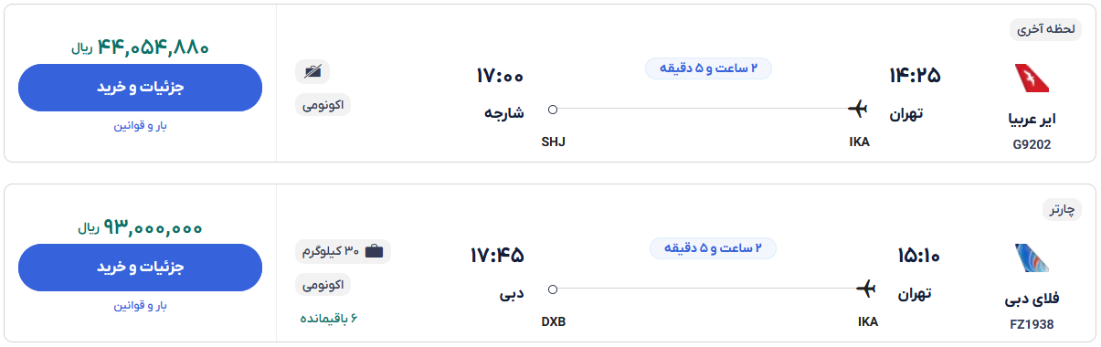 سرویس اقتصاد «انتخاب»: قیمت بلیط هواپیما تهران-دبی، امروز ۲۳ فروردین ۱۴۰۴ با پروازهای شرکت ایران ایر و فلای دبی اعلام شد. قیمت بلیط هواپیما تهران-دبی، امروز ۴ میلیون و ۴۰۵ هزار تومان و ۹ میلیون تومان به ثبت رسید.