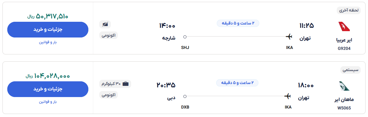سرویس اقتصاد «انتخاب»: قیمت بلیط هواپیما تهران-دبی، امروز ۲۴ فروردین ۱۴۰۴ با پروازهای شرکت ایران ایر و فلای دبی اعلام شد. قیمت بلیط هواپیما تهران-دبی، امروز ۵ میلیون و ۴۰۵ هزار تومان و ۱۰ میلیون تومان به ثبت رسید.