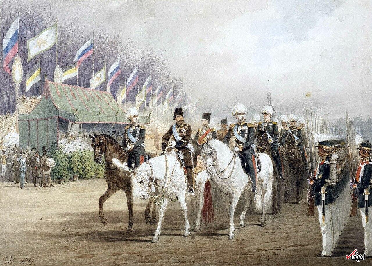 سرویس تاریخ «انتخاب»: این نقاشی مربوط به رژه الکساندر دوم روسیه و ناصرالدینشاه در اولین سفر وی به اروپا در سال ۱۸۷۳ و اثر میهای زیچی است. میهای زیچی نقاش، گرافیست و از چهرههای برجستهٔ نقاشی رمانتیک مجارستان است. اولین سفر ناصرالدینشاه در تاریخ ۱۹ آوریل ۱۸۷۳ (۳۰ فروردین ۱۲۵۲) آغاز شد که نخستین مسافرت یکی از پادشاهان ایران به اروپا بود. قبل از او هیچیک از سلاطین ایران به یک کشور مسیحی قدم نگذاشته بودند. ناصرالدینشاه در آن زمان چهل و سه سال داشت و بیست و پنج سال از حکومتش بر ایران میگذشت. این سفر به توصیه صدراعظم، میرزا حسینخان سپهسالار ترتیب داده شده بود.