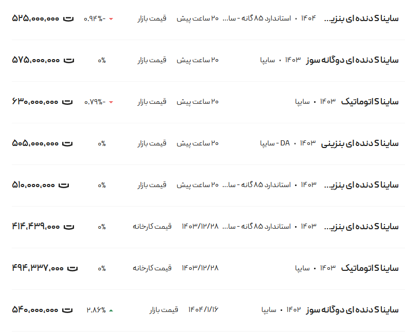 سرویس اقتصاد «انتخاب»: قیمت ساینا، امروز ۲۶ فروردین ۱۴۰۴ در مدلهای «دندهای، اتوماتیک و دوگانه» اعلام شد.