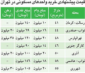 به عنوان مثال واحدی 48 متری در محدوده تهرانپارس از سوی مالک با قیمت کل 175 میلیون تومان برای فروش پیشنهاد شده است که 120 میلیون تومان نقدی، 35 میلیون تومان آن رهن و 20 میلیون تومان مشمول وام است.